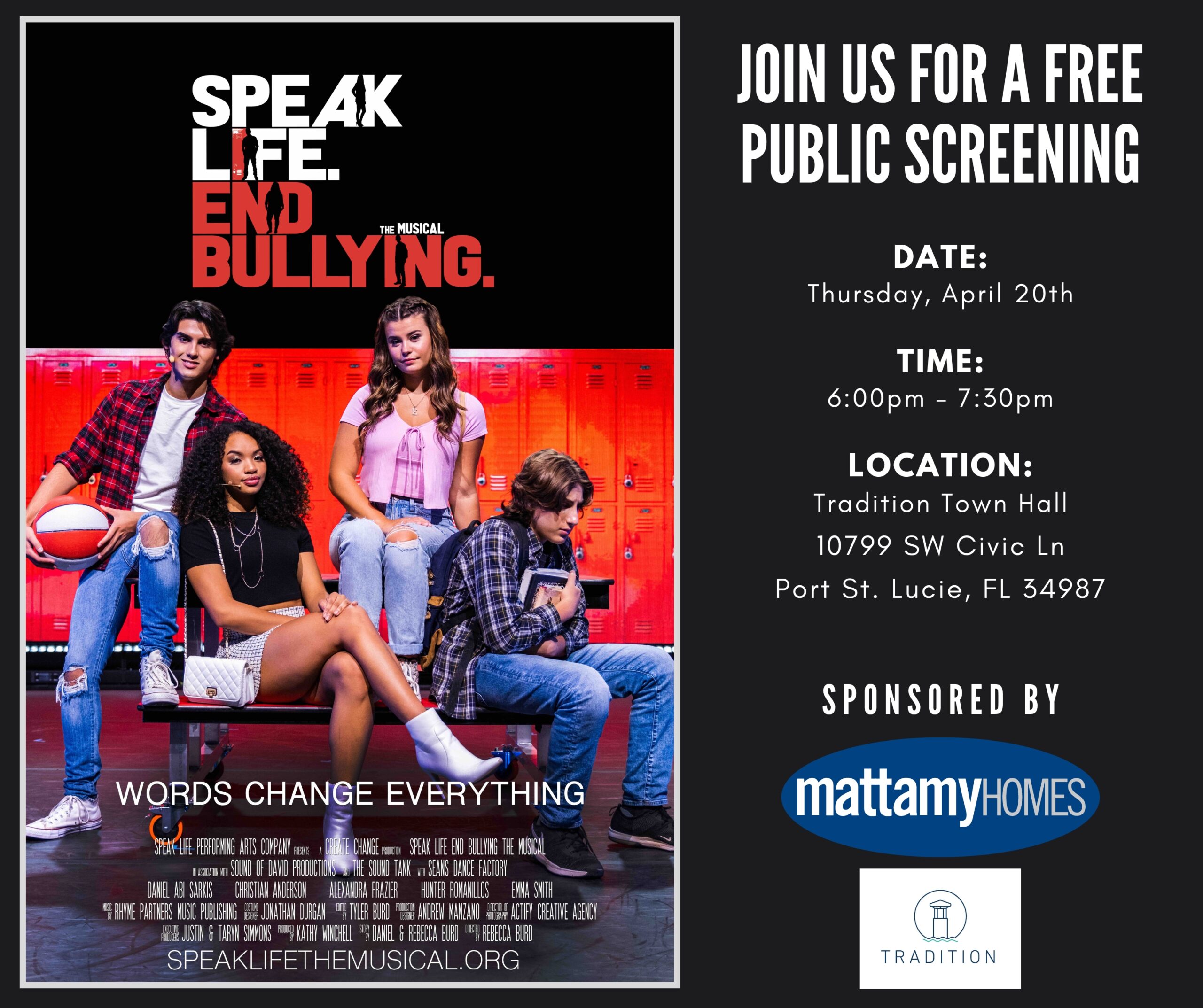 You’re invited to an event that champions kindness and respect. Join Mattamy Homes and Tradition for a free public screening of Speak Life End Bullying the Musical. This groundbreaking new film combats bullying through the power of storytelling and music. The event will take place on Thursday, April 20th from 6:00 PM to 7:30 PM at the Tradition Town Hall.